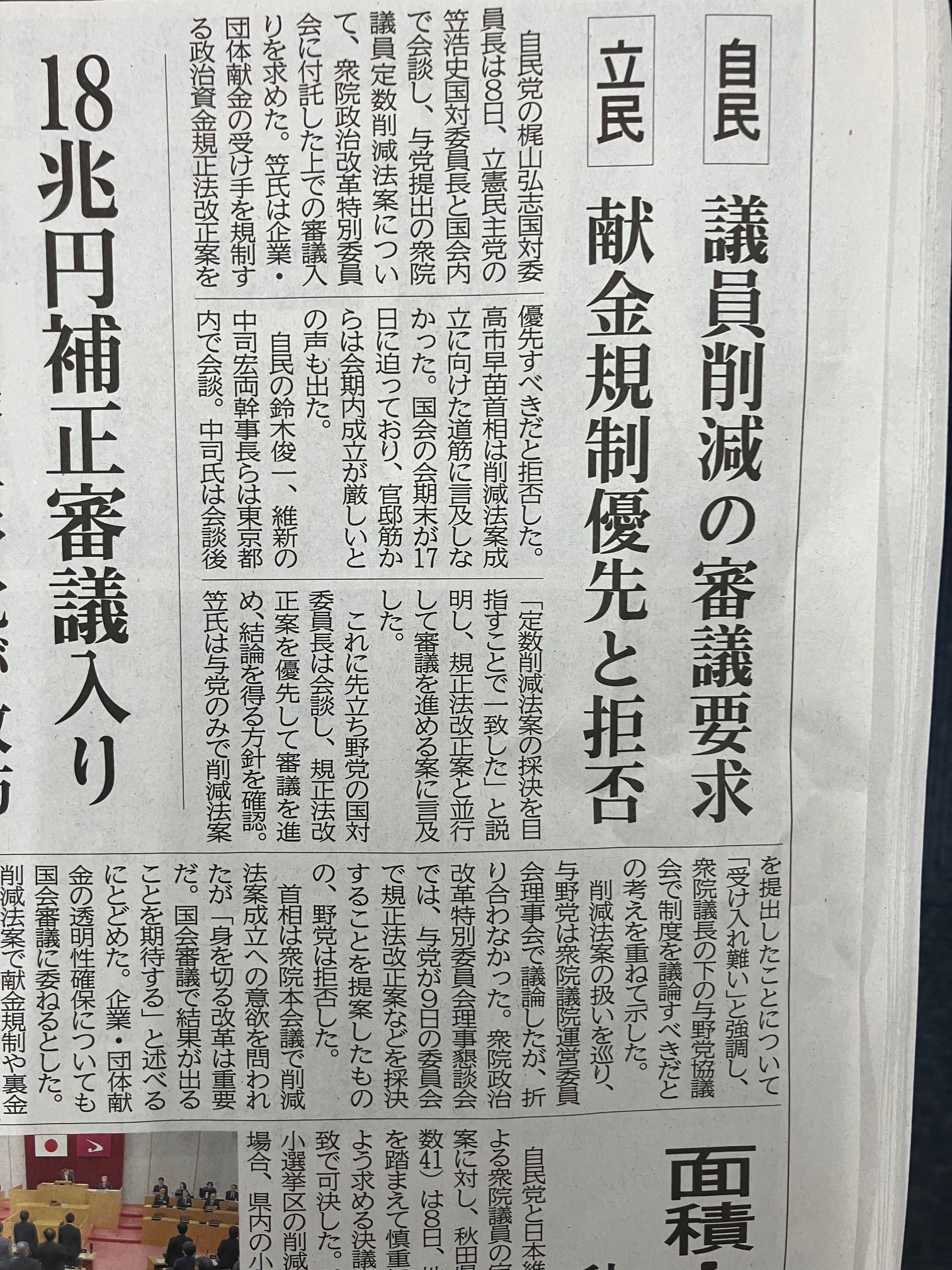 議員削減についても、上っ面なことではなく本質の議論をお願いしたいものだ。特に議員定数問題に関しては、定数削減が人口比のみを基準となっていることだ。『広大な面積と人口減少という構造的な問題を抱える地方の実態を十分に反映されない』とう大問題が発生するということである。