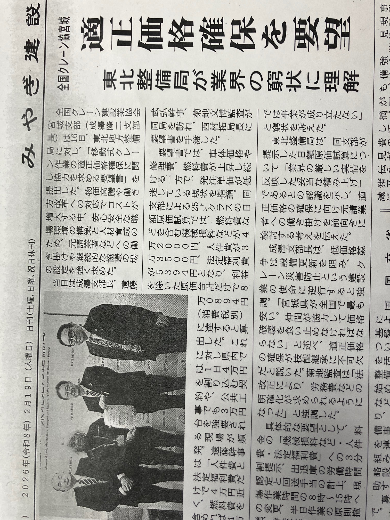 先日、クレーン協会宮城支部として東北整備局の西村拓局長充てに要望書を提出させていただいた。内容は『移動式クレーン作業の適正価格確保に関し協力を求める要望』である。