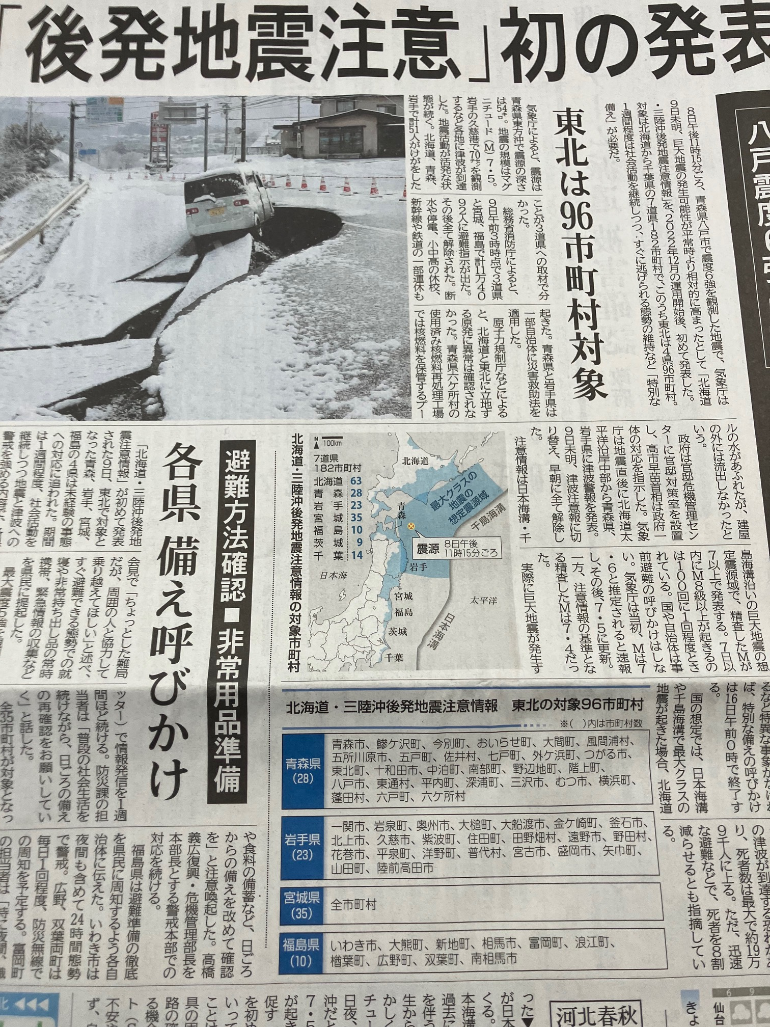 『北海道・三陸沖 後発地震注意報』が発表された。初めて聞く言葉である。一昨日、丁度寝室で寝ようと掛布団を上げたところ、けたたましく緊急地震速報のアラームが鳴り響いた。しばらくぶりの緊急速報に驚かされた。その後静かに揺れが始まった。だんだんと揺れがひどくなる。「これな大きいぞ」と叫びながら身支度をし、愛犬モカにリードを付け、玄関のドアを置けっぱなしにした。 3~5分間ほど揺れていたのではないだろうか。長い時間揺れていたような感じだ。