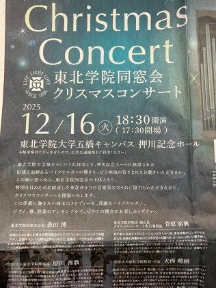 今日は、18:30開演Christmas concert(東北学院同窓会主催)にクラリネット演奏家として息子(阿部寛巳)が出演予定だ。少し早めに会社を後にし、東北学院大学五橋キャンパス 押川記念ホールへと向かった。800席はもう満席であった。音楽家になるという自分の人生の夢に向かって頑張りしかない。
